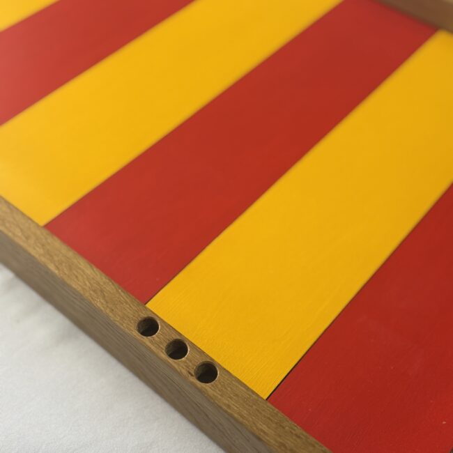 Le jeu en bois géant billard catalan est composé d'une structure de jeu en contre plaqué et kossipo (bois exotique), 8 pions boules (4 pions rouges et 4 pions jaunes) et 24 pions score. Règle du jeu incluse et disponible en fichier téléchargeable