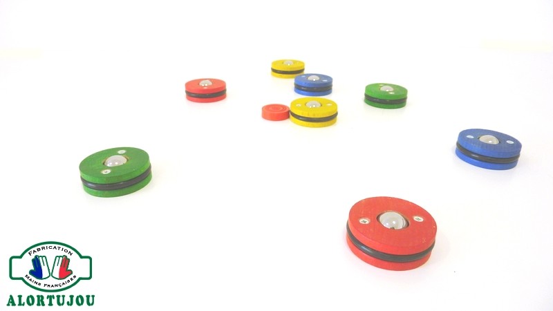 Le jeu en bois mini curling est composé de 8 "pions boules" de diamètre 50 mm, et d'épaisseur 16 mm, un pion cible en bois appelé "petit" et un sac de rangement en coton.